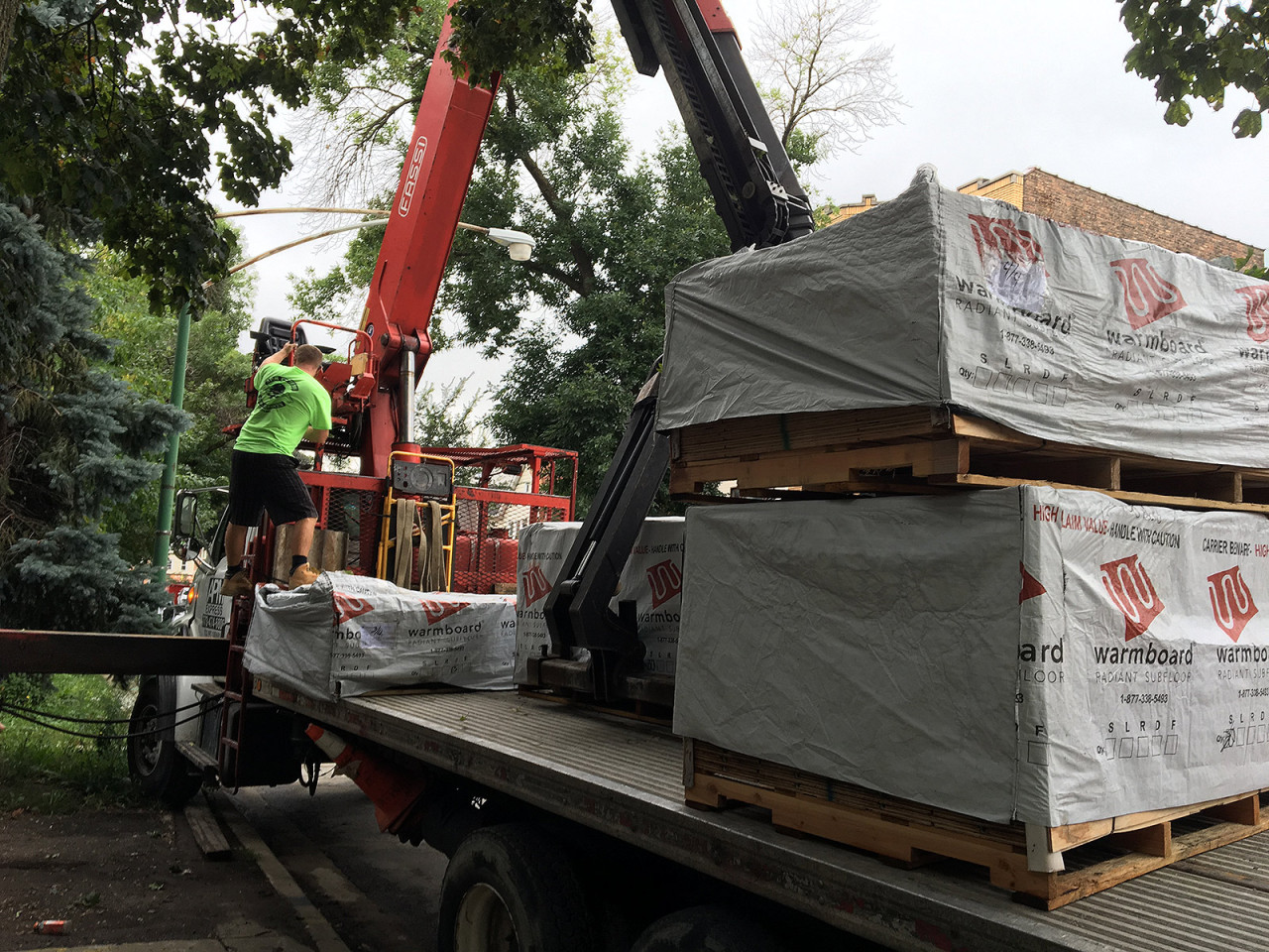 Warmboard-S being lifted and installed into the 2nd floor A few photos from a job site in Chicago. Final photo is obligatory dog tax. =)